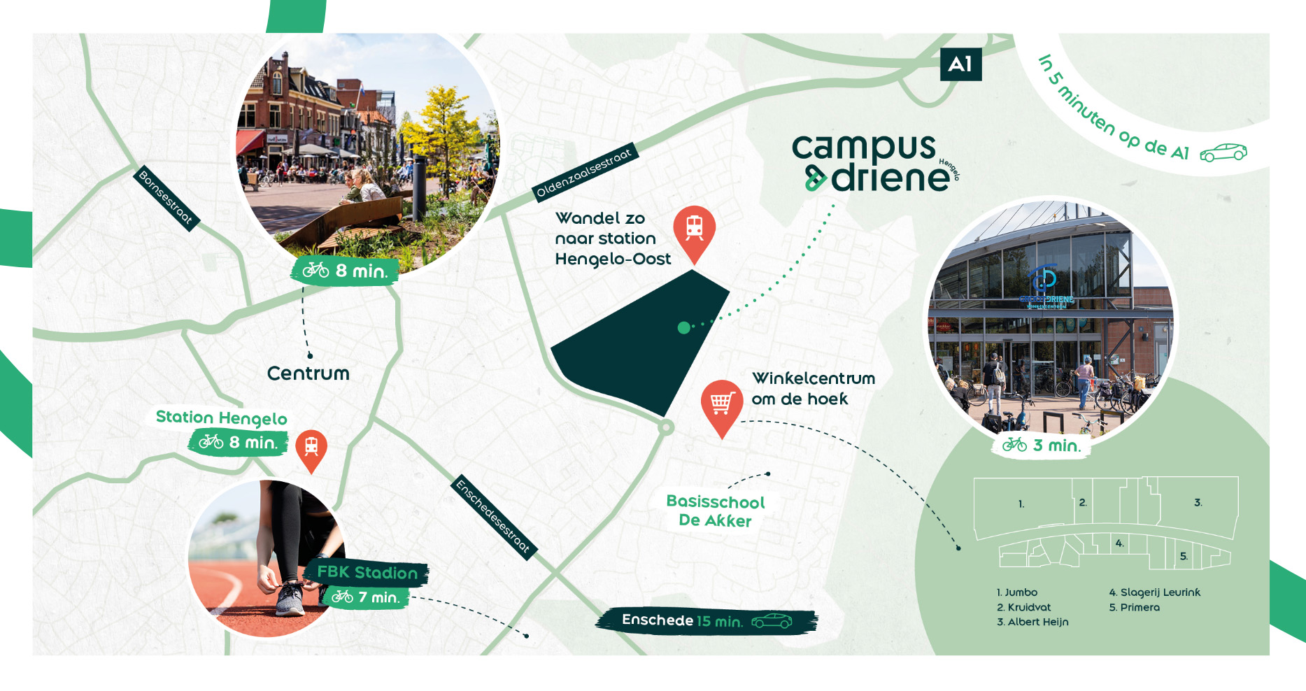 Campus Driene is ontworpen met respect voor de natuur! Bestaand groen blijft in de nieuwe buurt grotendeels behouden en regenwater wordt slim opgevangen in wadi’s. In het ontwerp van de woningen zijn natuurinclusieve details, zoals nestkasten voor huismussen en vleermuizen, alvast meegenomen. Kortom, een prettige leefplek voor mens en dier! In de groene omgeving kom je helemaal tot rust én wordt je uitgedaagd om in beweging te komen. Maak een ontspannende wandeling door de buurt, pak de fiets of jog een rondje over het sportlint. Kinderen leven zich uit op de natuurlijke speelplekken in de buurt.