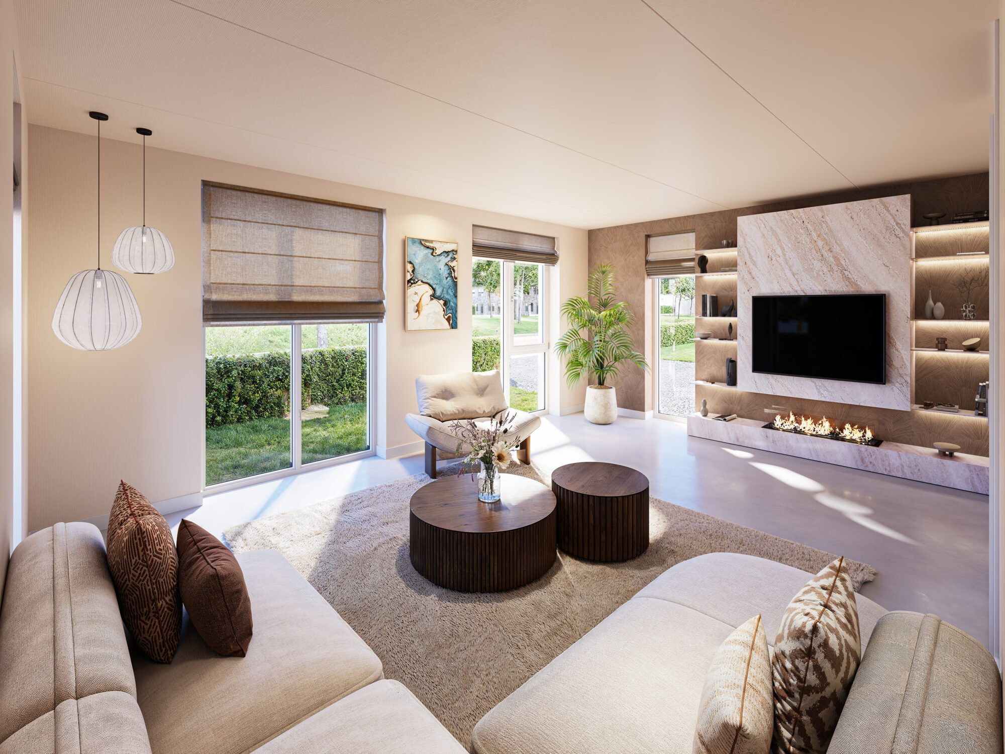Deze complete rijwoningen zijn slim ingedeeld. Aan één kant heb je een fijn terras met prachtig uitzicht richting de wadi. De hoofdentree bevindt zich aan de besloten tuinzijde. Zo kom je hier nog op z’n Twents binnen via de achterkant, terwijl je met de intercom gemakkelijk de voordeur opent.